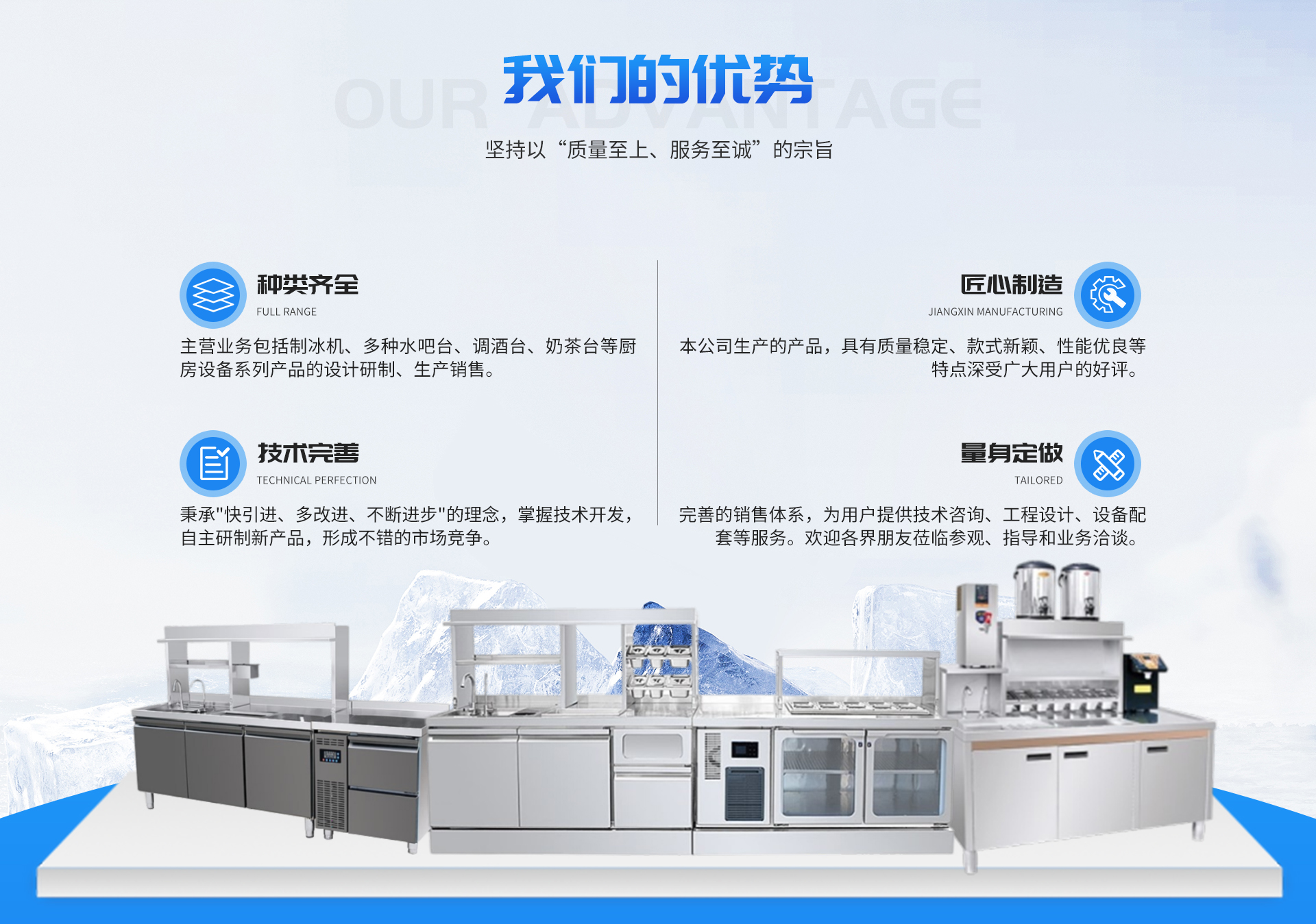 山东汇杰厨房设备有限公司,是一家商用水吧台和制冰机设备生产厂家,公司的主营业务包括制冰机、多种水吧台、调酒台、奶茶台等厨房设备系列产品的设计研制、生产销售。本公司生产的产品,具有质量稳定、款式新颖、性能优良等特点,深受广大用户的好评,目前已与国内数十家奶茶连锁品牌达成合作。公司长期以来,坚持以“质量至上、服务至诚”的宗旨,公司产品质量及市场信誉取得了诸多用户的好评,产品销往多个省市。我们以质量为本,以优良的产品和贴心的服务,满足了社会各界的需要。完善的销售体系,为用户提供技术咨询、工程设计、设备配套等服务。公司有成熟的技术队伍、优良的设计团队、丰富的经验、完善的售后服务,为客户提供贴心周到的服务。欢迎各界朋友莅临参观、指导和业务洽谈。